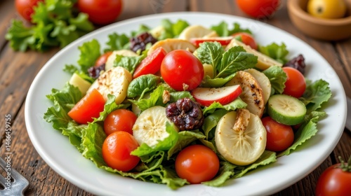 Colorful Fresh Salad with Tomatoes, Cucumbers, Apples, and Lemon on Rustic Wooden Table Setting