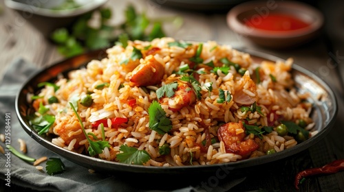 Colorful fried rice garnished with fresh cilantro, set on a dark iron plate, accompanied by a small bowl of spicy sauce in a rustic wooden setting.