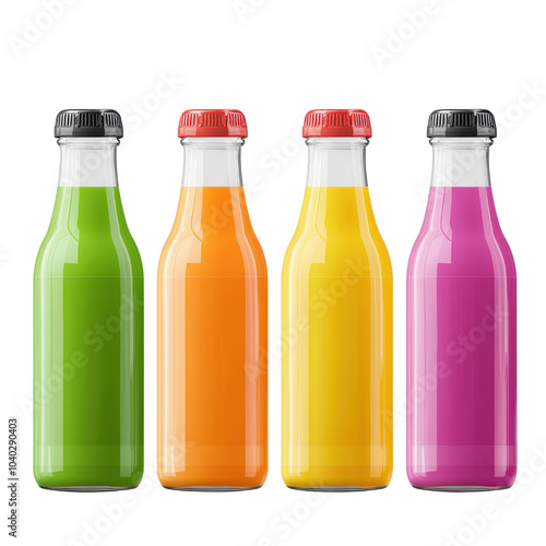 Colorful fruit juices in glass bottles on a white isolated background. transparent background.