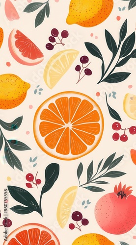 Colorful fruit pattern with oranges, lemons, cherries, and leaves in a vibrant, playful design on a light background.
