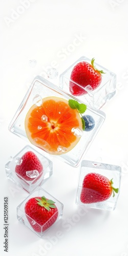 Colorful fruit surrounded by ice cubes creates refreshing summer vibe