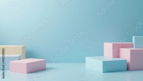 Colorful geometric action - playful blocks arrangement in studio soft lighting with minimalist design modern aesthetic approach