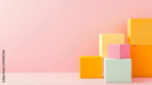 Colorful geometric blocks arranged creatively on a soft pink background.