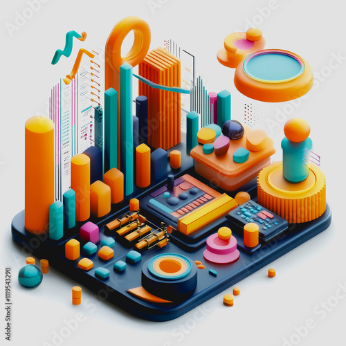 Colorful Geometric Data Visualization with 3D Shapes, Abstract Charts, and Modern Design Elements in Soft Pastel Tones