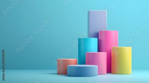 Colorful geometric shapes arranged in ascending order against a blue background, representing balance and symmetry in modern design.