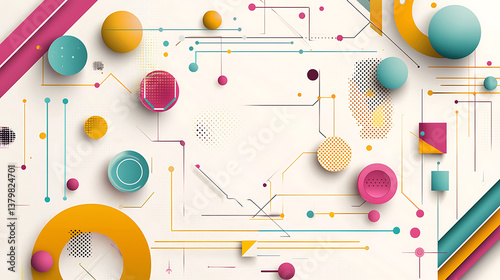 Colorful geometric shapes create abstract background with vibrant circles, lines, and patterns, evoking sense of creativity and modernity