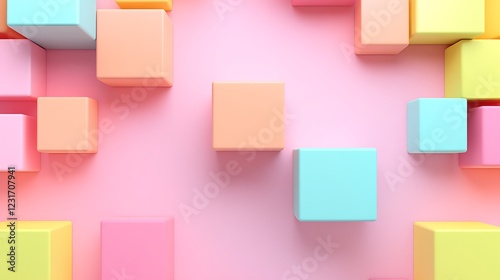 Colorful geometric shapes scattered on a soft pink background creating a playful and whimsical visual effect