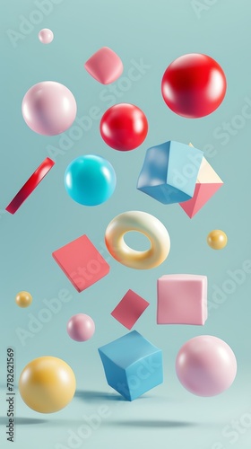 Colorful geometric shapes suspended in midair 3D style isolated flying objects memphis style 3D render AI generated illustration