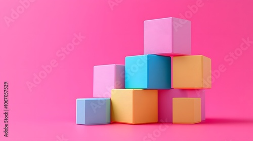 Colorful geometric wooden blocks stacked in ascending order on a pastel pink backdrop, showcasing a minimalist and educational aesthetic with soft studio lighting and modern design.