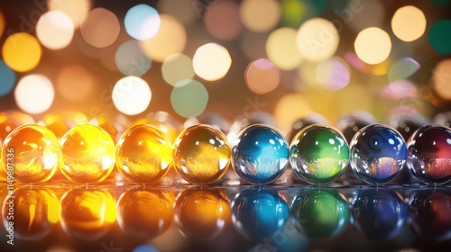 Colorful glass marbles arranged in row, reflecting light and creating vibrant atmosphere