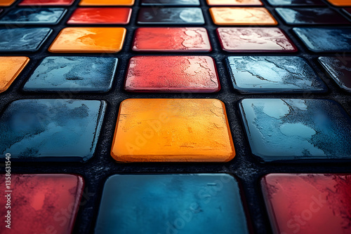 Colorful, glossy tiles arranged in a pattern, reflecting light, creating a vibrant atmosphere