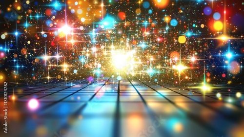 Colorful glowing lights on a tiled floor, starburst effect background, digital backdrop