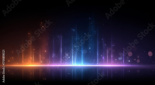 Colorful, glowing line of lights that are reflected in the water. The image has a dreamy, ethereal quality to it