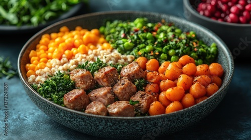 Colorful healthy bowl with quinoa, greens, chickpeas, and meat, garnished with berries in background