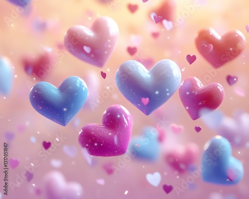 Colorful hearts floating gently over a soft pink gradient, symbolizing love and romance, creating a dreamy Valentines Day atmosphere, ultrarealistic, 4K render