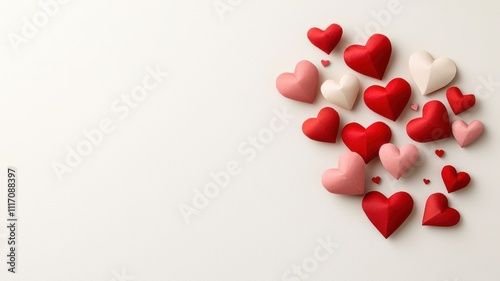 Colorful hearts in various shades scattered on a light background, symbolizing love and affection.