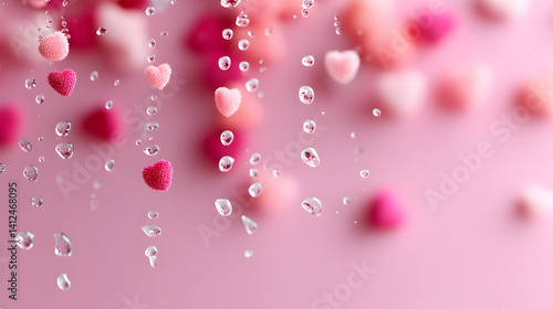 Colorful heart-shaped confetti with sparkling water droplets on a soft pink background, creating a romantic and festive atmosphere, perfect for celebrations and love-themed events, love concept