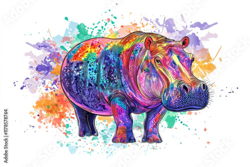 Colorful hippopotamus illustration with vibrant splashes and artistic flair