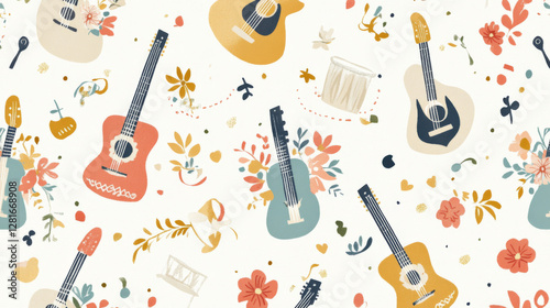 Colorful holiday mexican guitar pattern with music-themed elements as celebration background