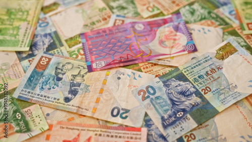 Colorful hong kong dollar banknotes in various denominations scattered across a surface showcasing vibrant currency design and financial elements