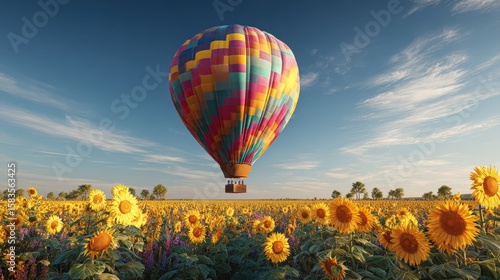 Colorful Hot Air Balloon Soaring Over a Vibrant Sunflower Field at Sunset