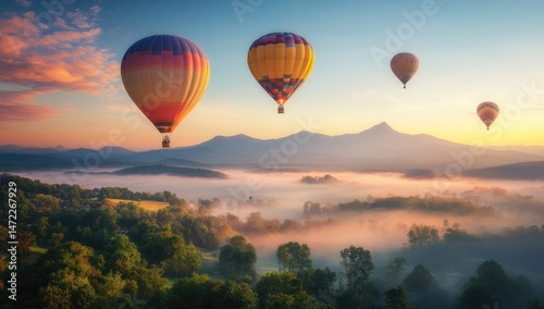 Colorful hot air balloons floating over misty mountains at sunrise, symbolizing freedom and adventure in the landscape of Thailand.