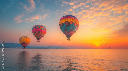 Colorful hot air balloons soar gently over tranquil waters, illuminated by the warm hues of a stunning sunset that lights up the sky. Generative AI