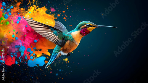 Colorful Hummingbird In Flight Amidst Paint Splatter