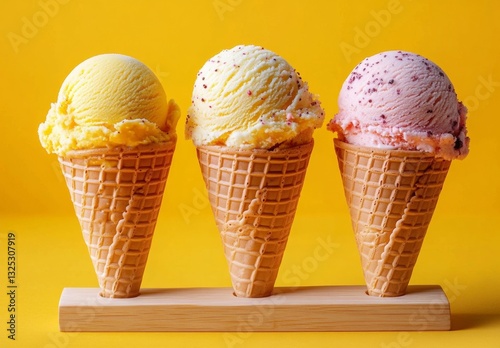 Colorful Ice Cream Cones Displayed on a Wooden Stand Against a Bright Yellow Background in a Summer Dessert Theme