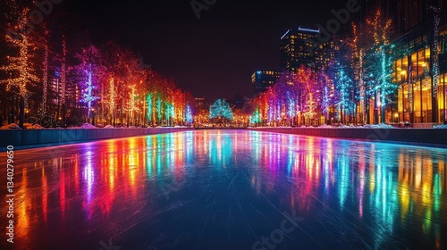 Colorful ice skating rink at night, illuminated by vibrant Christmas lights reflecting on the smooth ice surface, surrounded by decorated trees and modern city buildings.