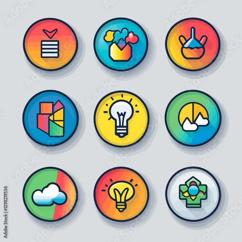 Colorful Icon Set Representing Business Concepts and Creative Ideas