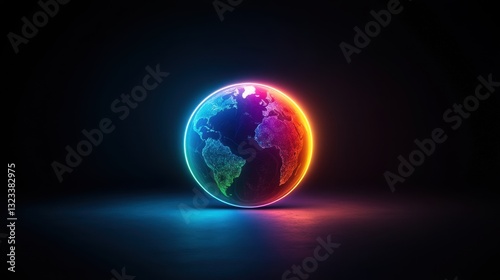 Colorful illuminated globe with vibrant light effects representing Earth in cosmic environment with dark background and vivid glowing colors
