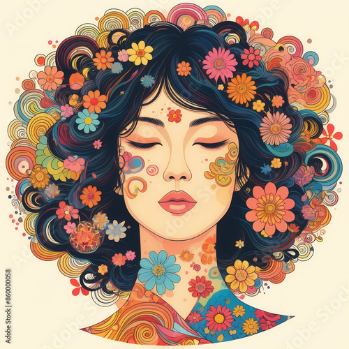 Colorful illustration of a woman's face embracing psychedelic 'flower power' revival, featuring vibrant colors and retro artistic vibes