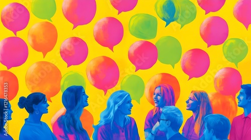 Colorful illustration of people engaging in conversation with speech bubbles in a vibrant background.