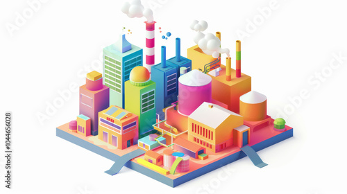 Colorful industrial cityscape featuring various factories, smokestacks, and buildings, showcasing vibrant and modern design. scene captures essence of urban industry and innovation