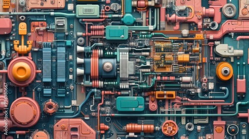 Colorful, intricate, and detailed illustration of an electrical circuit diagram showing interconnected components,