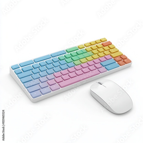 Colorful keyboard and mouse set on white background, showcasing vibrant design that adds playful touch to any workspace. Perfect for creative environments