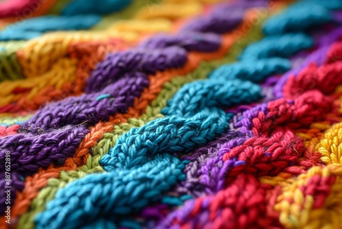 Colorful Knitted Pattern Backgrounds, A tightly woven fabric texture highlights individual threads, Close-up image of vibrant multicolored yarn, displaying a range of colors, AI generated