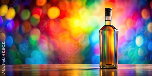 Colorful labeled alcohol bottle with black cap on table against colorful background, colorful, alcohol, bottle