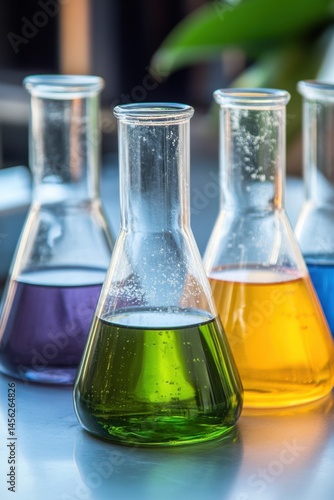 Colorful laboratory flasks with various liquids in a science experiment setting during daylight