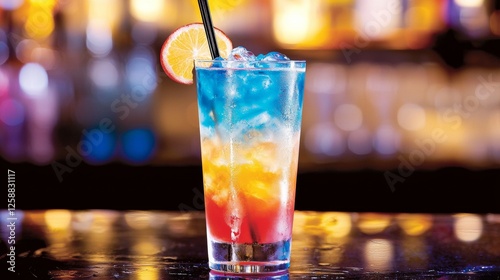 Colorful layered cocktail served in a tall glass with a slice of lemon on a bar counter
