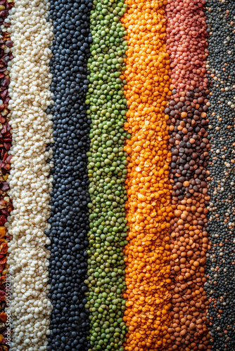 Colorful Lentils, A vibrant display of various lentils and legumes arranged in colorful stripes, showcasing a beautiful and appealing assortment of these nutritious foods