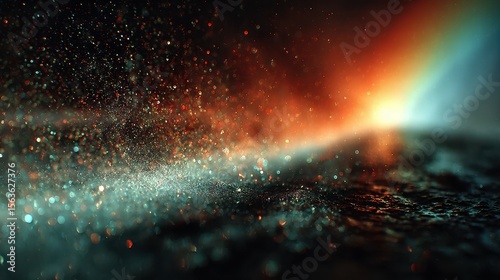 Colorful light rays create beautiful reflections on a damp surface during nighttime
