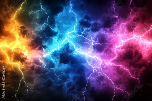 Colorful lightning illuminates a dramatic sky filled with vibrant clouds during a stormy night