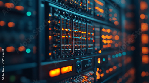Colorful lights illuminate a server rack in a modern data center at night