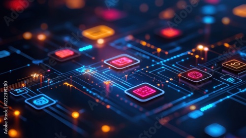 Colorful lights illuminate an intricate network of circuits and icons representing advanced technology