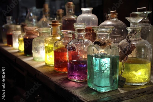 Colorful liquids in antique bottles on a wooden shelf in a dimly lit room; alchemy, potion-making
