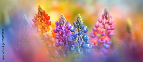 Colorful lupin flowers in soft focus creating a dreamy and vibrant floral background.