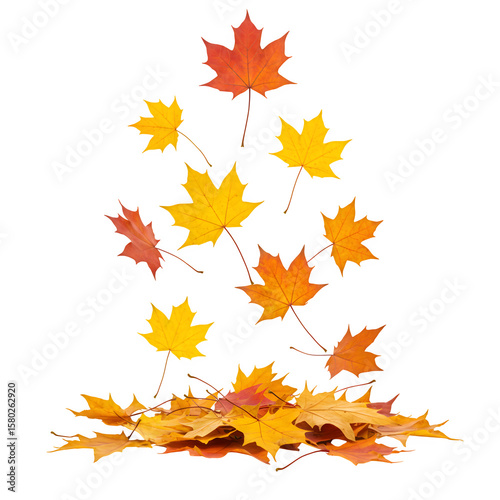 Colorful maple leaves gracefully falling isolated on white or transparent background. PNG format.