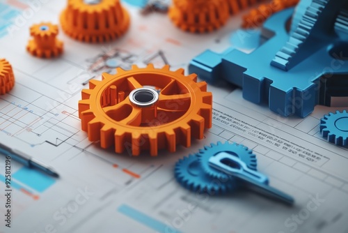 Colorful mechanical gears and blueprints illustration representing engineering, teamwork, and industrial design concepts.